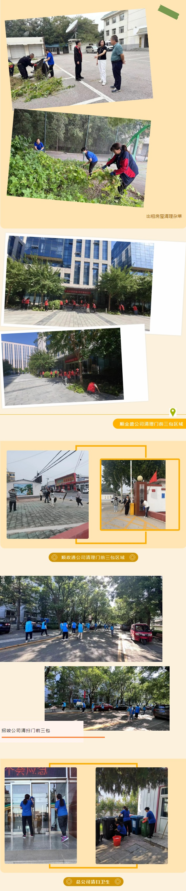 為迎接中秋、國(guó)慶節(jié)到來(lái),助推全區(qū)文明城區(qū)建設(shè),營(yíng)造良好的節(jié)日氛圍,全面提升辦公場(chǎng)所環(huán)境衛(wèi)生質(zhì)量,創(chuàng)造舒適、優(yōu)美、整潔的辦公環(huán)境,順義建投總公司及各子公司對(duì)各辦公區(qū)域及院落場(chǎng)所開(kāi)展節(jié)前環(huán)境衛(wèi)生大掃除活動(dòng)。