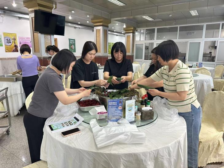 6月5日,食堂內(nèi)粽葉飄香,歡聲一片。大家互相幫助、互相學(xué)習(xí)、互相切磋技藝,沉浸在一片歡樂(lè)祥和的節(jié)日喜慶中?;顒?dòng)現(xiàn)場(chǎng),糯米、粽葉等必備材料被整齊地?cái)[上桌,大家紛紛向“高手”取經(jīng),學(xué)習(xí)包粽子技巧,折粽葉、填糯米、裹葉子、扎線……只見一雙雙巧手在歡聲笑語(yǔ)中上下翻飛。大家一邊包粽子,一邊聊著節(jié)日風(fēng)俗,很快三角形、喇叭形、牛角形、長(zhǎng)條形等各式各樣的漂亮粽子,就這樣一個(gè)個(gè)在大家手中誕生了整個(gè)活動(dòng)沉浸在一片輕松愉悅的氛圍中,活動(dòng)結(jié)束后大家將親手包的粽子帶回家,跟家人分享節(jié)日的喜悅。