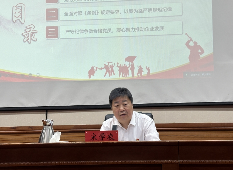 宋學(xué)農(nóng)同志從“把握黨的紀(jì)律建設(shè)的歷史沿革、全面對照《條例》規(guī)定要求,嚴(yán)守紀(jì)律爭做合格黨員”三個方面進(jìn)行詳細(xì)授課。回望黨的奮斗史,紀(jì)律嚴(yán)明是我們黨的光榮傳統(tǒng)和獨特優(yōu)勢。中國共產(chǎn)黨的成立之日起,就要嚴(yán)格按照馬克思主義建黨原則,把紀(jì)律和規(guī)矩寫在旗幟上。授課過程中,宋學(xué)農(nóng)同志結(jié)合國企改革發(fā)展使命、公司主責(zé)主業(yè)、創(chuàng)建文明城市等重點方面,用真實的案例和詳實數(shù)據(jù),警示大家嚴(yán)守黨的紀(jì)律教育任重道遠(yuǎn)。