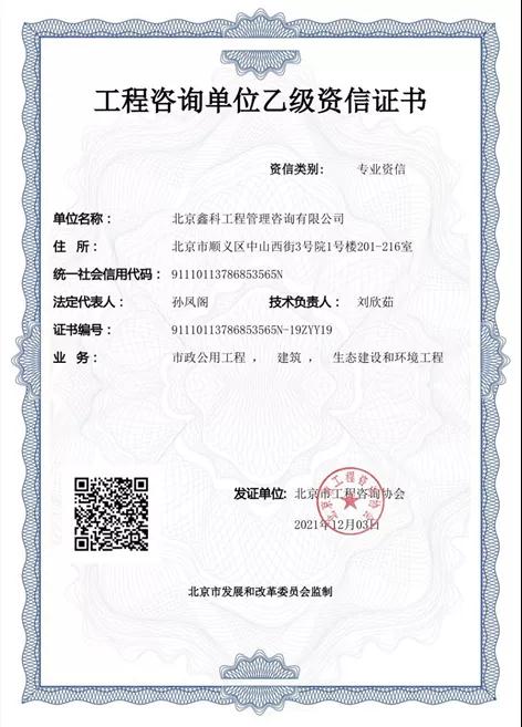 順義建投下屬鑫科公司取得生態(tài)建設(shè)和環(huán)境工程專業(yè)乙級(jí)資信