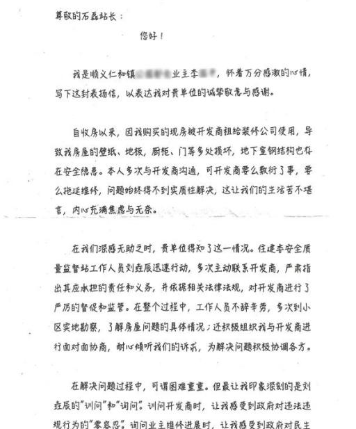 順義建投下屬順政通收到了區(qū)住房和城鄉(xiāng)建設委員會建設工程安全質量監(jiān)督站發(fā)來的表揚信,對順政通公司員工劉垚辰同志在駐勤工作中給予了充分的肯定與認可