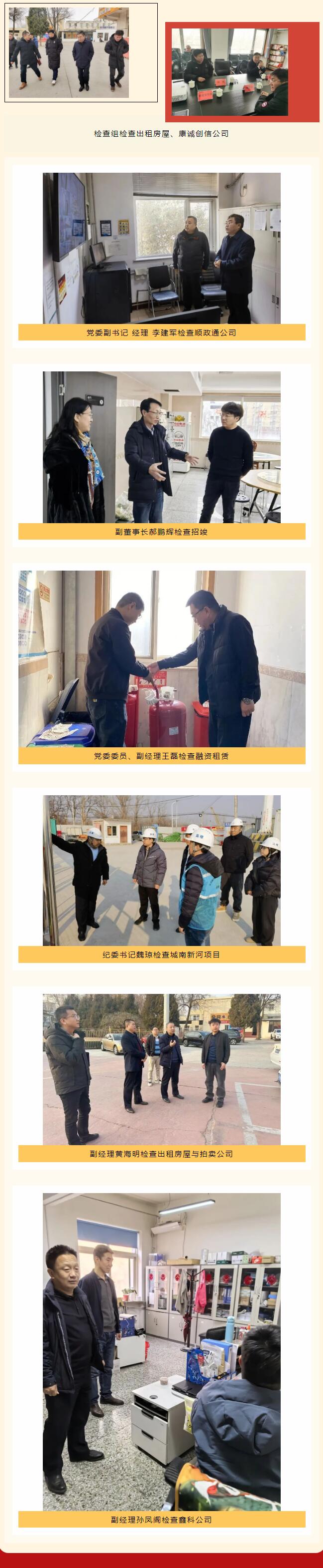 為切實(shí)做好春節(jié)期間服務(wù)保障工作,確保節(jié)前重點(diǎn)工作部署會各項(xiàng)工作要求落實(shí)到位,按照《重要時(shí)期安全服務(wù)保障方案》安排,順義建投領(lǐng)導(dǎo)班子成員帶隊(duì)對下屬子企業(yè)開展督導(dǎo)檢查,確保春節(jié)期間企業(yè)安全穩(wěn)定。1月23日——1月26日,公司領(lǐng)導(dǎo)班子采取分片包干形式,對下屬企業(yè)的辦公區(qū)域、監(jiān)理項(xiàng)目、出租房屋等進(jìn)行詳細(xì)檢查,對發(fā)現(xiàn)的問題,要求認(rèn)真整改,確保落實(shí)到位。