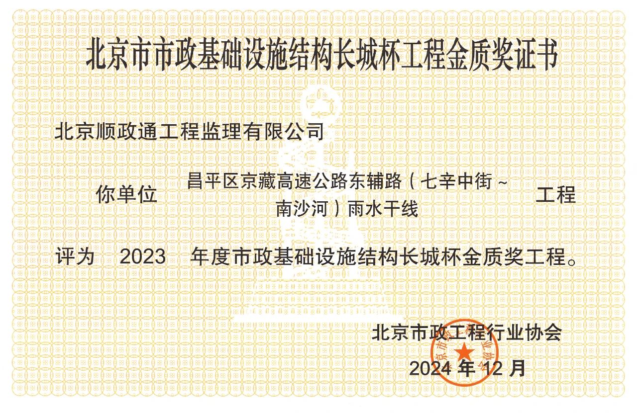 2025年3月,順政通工程監(jiān)理有限公司獲得北京市政工程行業(yè)協(xié)會(huì)頒發(fā)的獲獎(jiǎng)證書,公司監(jiān)理的"昌平區(qū)京藏高速公路東輔路(七辛中街-南沙河)雨水干線工程"項(xiàng)目榮獲“北京市2023年市政基礎(chǔ)設(shè)施結(jié)構(gòu)長城杯金質(zhì)獎(jiǎng)工程”。這一行業(yè)頂級(jí)榮譽(yù),既是對(duì)公司工程質(zhì)量的至高認(rèn)可,更彰顯了公司在水利及市政監(jiān)理領(lǐng)域的硬核實(shí)力!