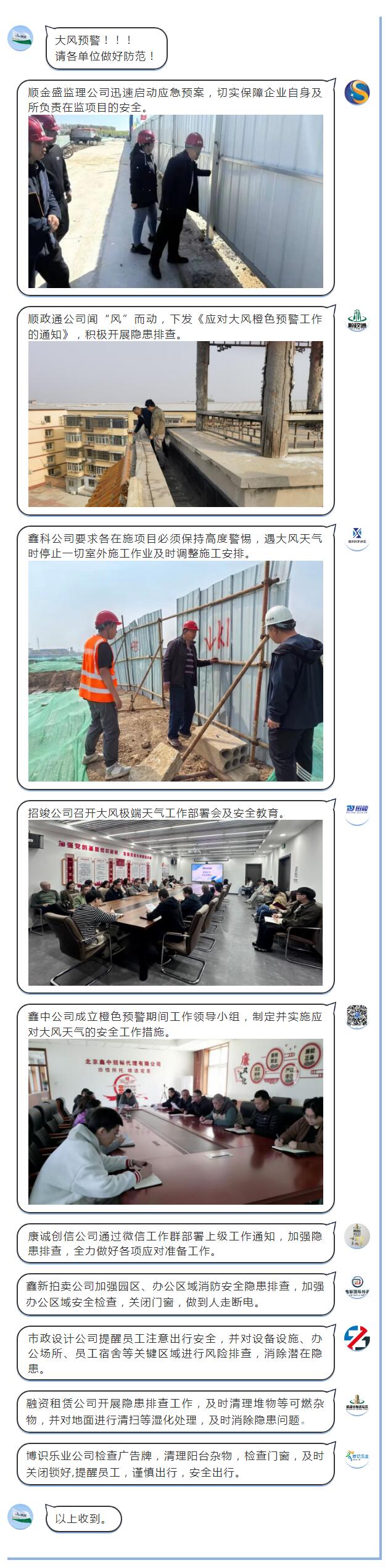 4月10日,區(qū)氣象臺發(fā)布大風(fēng)橙色預(yù)警,預(yù)計11日20時后陣風(fēng)高達8、9級,12日6時至22時平均風(fēng)速達6級,陣風(fēng)9~11級,并伴有沙塵和強降溫天氣。面對極端大風(fēng)天氣的嚴(yán)峻挑戰(zhàn),順義建投下屬各單位,以高效的行動和全面的舉措,切實保障監(jiān)理和管理的在施項目和辦公場所安全。