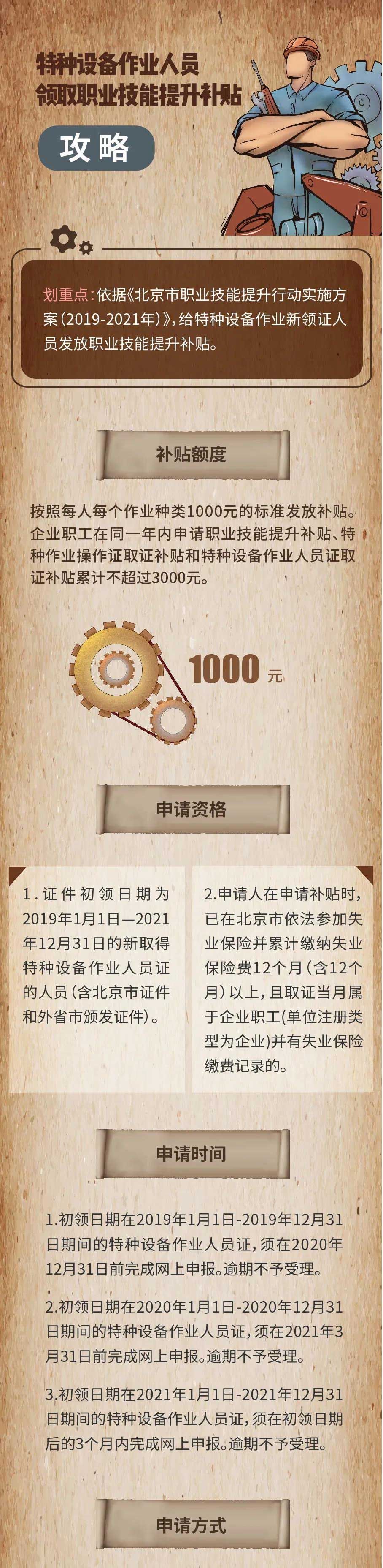為貫徹落實(shí)黨中央、國(guó)務(wù)院關(guān)于實(shí)施職業(yè)技能提升行動(dòng)決策部署,把職業(yè)技能培訓(xùn)作為保持就業(yè)穩(wěn)定、緩解結(jié)構(gòu)性就業(yè)矛盾的關(guān)鍵舉措,作為經(jīng)濟(jì)轉(zhuǎn)型升級(jí)和高質(zhì)量發(fā)展的重要支撐,按照北京市人民政府辦公廳關(guān)于印發(fā)《北京市職業(yè)技能提升行動(dòng)實(shí)施方案(2019-2021年)》的通知要求,北京市市場(chǎng)監(jiān)督管理局、北京市人力資源和社會(huì)保障局和北京市財(cái)政局共同推出職業(yè)技能培訓(xùn)支持方案,按照每人1000元的標(biāo)準(zhǔn),對(duì)2019年1月1日至2021年12月31日初次取得特種設(shè)備作業(yè)人員證件的個(gè)人進(jìn)行補(bǔ)貼。