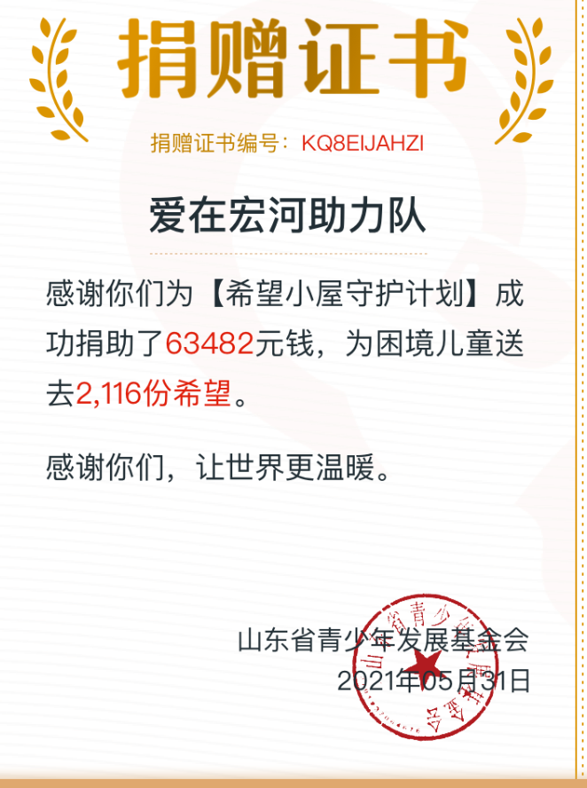 鄉(xiāng)村振興的路上, 孩子是我們最大的牽掛。 追逐夢想的途中, 愛是給孩子最好的賦能。 宏心向黨 聚力成河 讓希望、讓愛在宏河! 為一個孩子筑一方希望空間! “希望小屋”是共青團山東省委、山東青年聯(lián)合會、山東省青少年發(fā)展基金會共同發(fā)起的困境兒童關(guān)愛項目,自2020年6月啟動發(fā)起募捐倡議以來,受到全社會廣泛關(guān)注和支持。2020年集團共籌集到愛心捐款138611元,兩年來捐款所得款累計20萬余元,統(tǒng)一定向給鄒城市希望小屋項目建設(shè)。集團廣大干部職工齊心協(xié)力從“希望小屋”出發(fā),以“為群眾辦實事”的初心責(zé)任,匯聚愛心傳遞對困境兒童的關(guān)愛,幫助更多有需要的孩子改善現(xiàn)狀走出困境,健康成長為祖國的棟梁之才。 近年來,宏河集團秉承“幸福員工、鑄就未來、服務(wù)社會、溫暖人間”的企業(yè)使命,積極關(guān)注并致力于社會公益活動,通過黨、政、工、團群體組織積極摸排協(xié)調(diào)并解決貧困職工家庭問題,特別是貧困殘疾人員家庭無獨立居住和學(xué)習(xí)環(huán)境孩子的教育問題。在以往金秋助學(xué)、愛心送考、精準扶貧、慈心一日捐、抗疫捐款等工作及公益活動中,主動承擔(dān)社會責(zé)任,持續(xù)關(guān)心關(guān)注孩子們的生活和教育問題,希望通過此次為“希望小屋”的捐款,幫助更多孩子們健康成長。 自“希望小屋”兒童關(guān)愛項目實施以來 一座座“希望小屋”陸續(xù)在齊魯大地 生根萌芽、開花結(jié)果 “希望小屋” 承載著愛與希望 呵護每一個孩子的心靈 守護每一個家庭的未來 涓涓細流匯聚大愛江海 點點星光閃耀希望銀河 每一份愛心都將化為強大的力量 我們將帶著大家共同的愛繼續(xù)前進 給需要幫助的孩子生活帶來改變 用“小小的善舉” 助力孩子們“大大的夢想”! |
