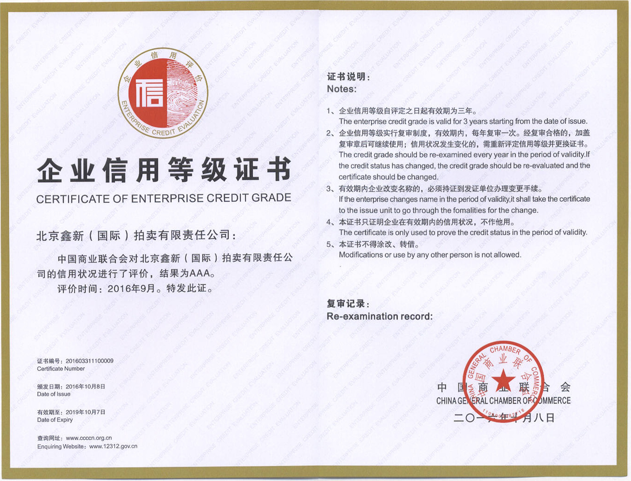 北京鑫新國際拍賣有限責(zé)任公司成立于2002年11月18日,經(jīng)北京市商委、北京市公安局、北京市工商局批準(zhǔn)注冊成立,注冊資本2000萬元。現(xiàn)擁有國家注冊拍賣師5人,拍賣從業(yè)人員20人,國家注冊舊機(jī)動(dòng)車鑒定評估師6人,產(chǎn)權(quán)經(jīng)紀(jì)人3人,為中國拍賣行業(yè)協(xié)會理事單位、北京拍賣行業(yè)協(xié)會理事單位,中國拍賣行業(yè)協(xié)會AAA級企業(yè),中國商業(yè)聯(lián)合會企業(yè)信用評價(jià)AAA級信用企業(yè),具有北京產(chǎn)權(quán)交易所、北京金融資產(chǎn)交易所經(jīng)紀(jì)人資格,北京海關(guān)、北京法院、順義區(qū)財(cái)政局等機(jī)構(gòu)入圍拍賣企業(yè)。拍賣業(yè)務(wù)范圍包括法院、海關(guān)等的訴訟及罰沒資產(chǎn);銀行等金融系統(tǒng)的不良資產(chǎn);有關(guān)國家機(jī)關(guān)委托的罰沒物品;各種國家允許流通的有形資產(chǎn)、無形資產(chǎn)的咨詢、展示、鑒定、拍賣等服務(wù)。