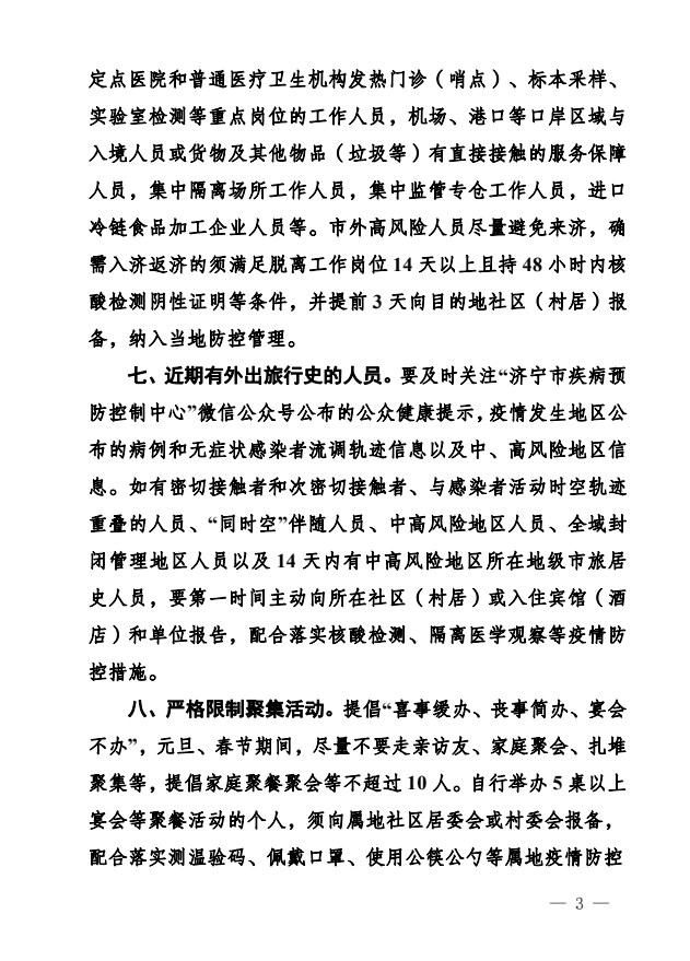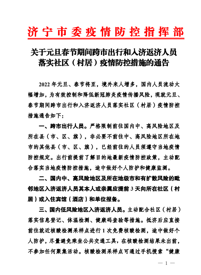 關于元旦春節(jié)期間跨市出行和入濟返濟人員 落實社區(qū)(村居)疫情防控措施的通告